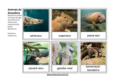 Para transformar essa jornada em uma experiência de aprendizado lúdica, visual e interativa, criamos um kit de cartões com os Animais da Amazônia. Este material versátil foi pensado para ser usado como jogo da memória, cartões de nomenclatura ou como a base para uma infinidade de atividades que celebram a nossa biodiversidade.