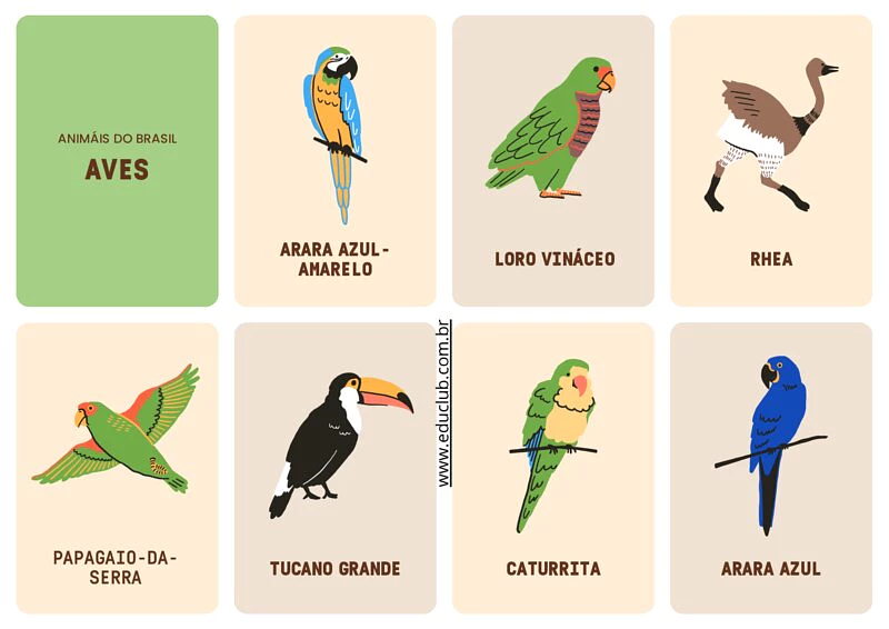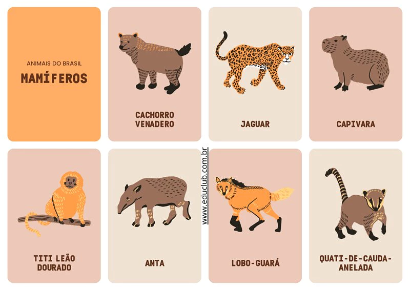 Neste material, você encontrará cartões ilustrados com diversos animais do Brasil, divididos por categorias como mamíferos, aves, peixes, répteis e anfíbios. Cada cartão apresenta o nome do animal e uma imagem clara, facilitando a identificação e a associação. Há também uma seção comparativa de tamanhos de alguns animais.