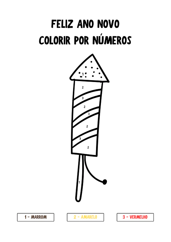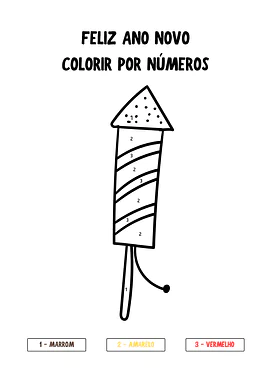 Neste material, você encontrará cinco páginas de atividades de colorir por números, todas com o tema Feliz Ano Novo. Cada página apresenta um desenho diferente e uma legenda com números e suas respectivas cores (amarelo, vermelho, preto, marrom, azul, laranja, rosa), desafiando as crianças a seguirem as instruções para revelar a imagem.