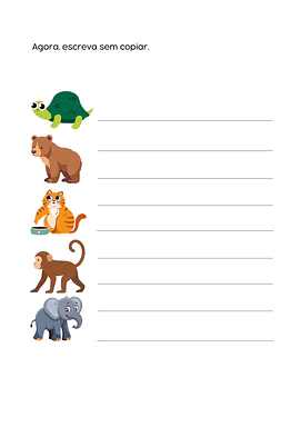Desafio final: Uma seção na parte inferior da folha convida a criança a escrever os nomes dos animais sem o apoio do tracejado, estimulando a memória e a autonomia na escrita.