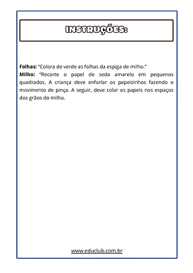 Nesta atividade de coordenação motora fina com milho, você encontrará uma folha com o desenho de uma espiga de milho, acompanhada de instruções claras para colorir as folhas de verde e preencher os grãos de milho. A atividade sugere o uso de papel de seda amarelo, recortado em pequenos quadrados, para ser amassado e colado, promovendo o movimento de pinça.