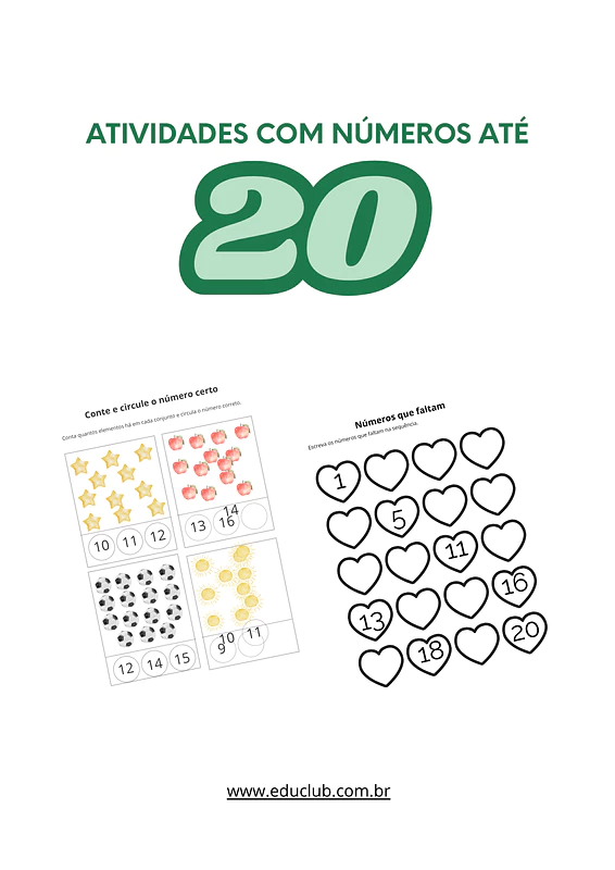 O conjunto de Atividades com números até 20 é um material pedagógico, ideal para a fase em que a criança está consolidando seu entendimento sobre os números, indo além da primeira dezena. O material serve como um excelente recurso para praticar, reforçar e avaliar a compreensão dos conceitos numéricos de forma lúdica e estruturada.
