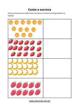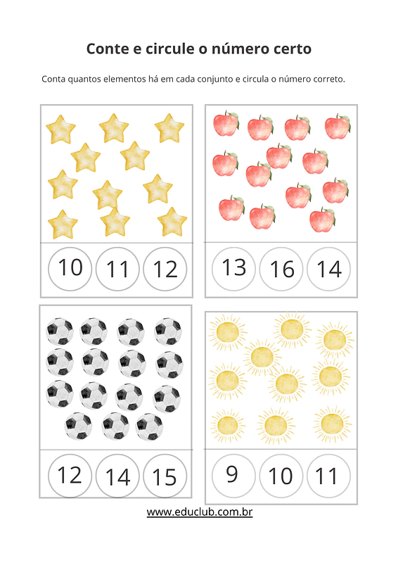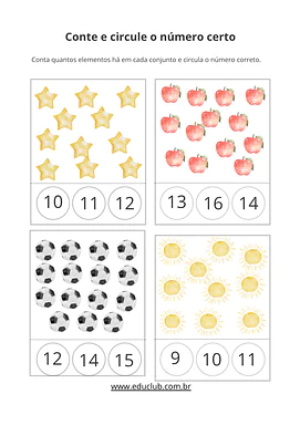 • Contagem e associação: Fichas para contar conjuntos de elementos e circular o numeral correspondente.