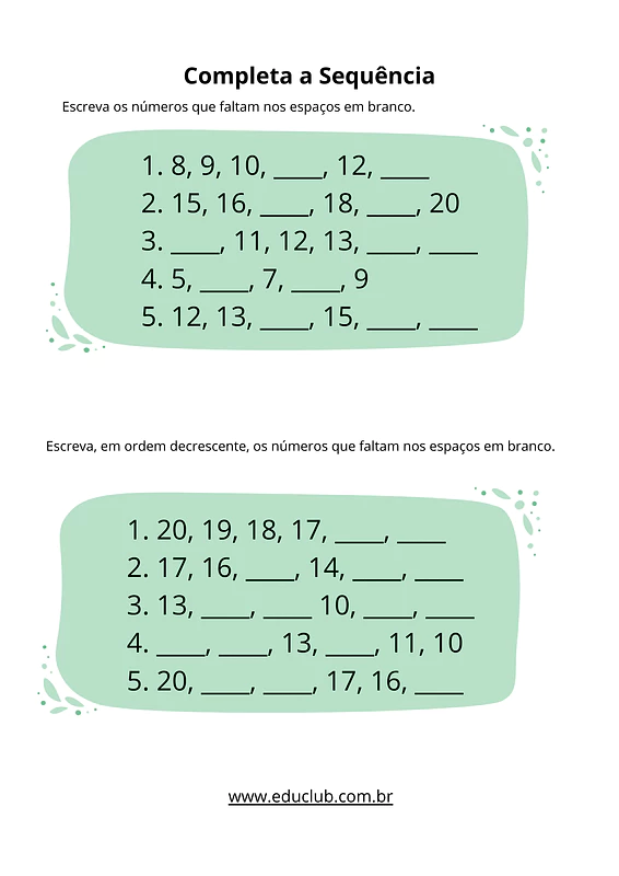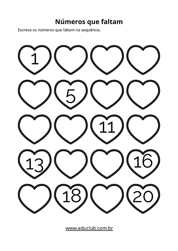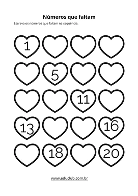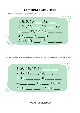 • Sequência numérica: Atividades para completar sequências lógicas e preencher números faltantes em grades.