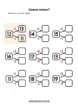 • Cálculos iniciais: Exercícios simples de adição e subtração, com suporte visual e estrutura de "mais 1, menos 1", etc.