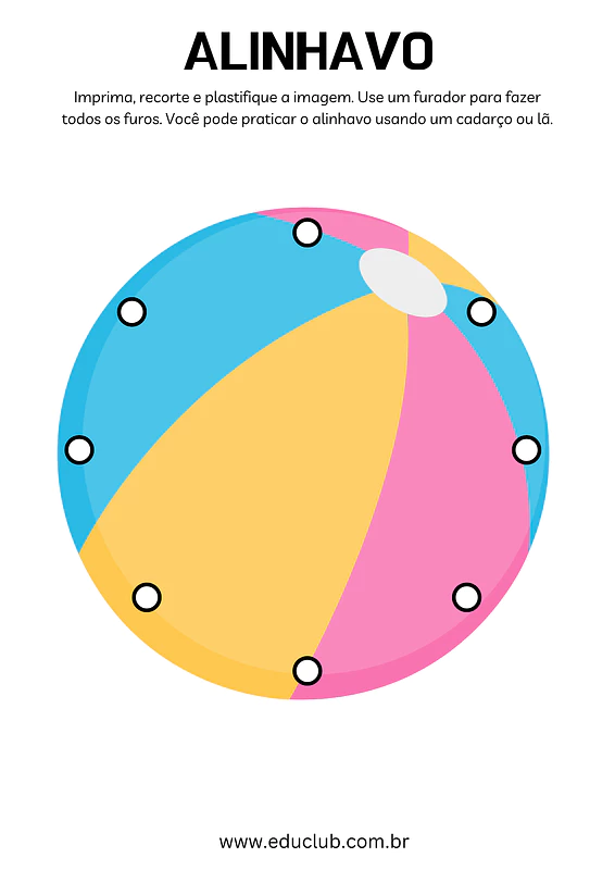 O material disponível para impressão contém diversas figuras coloridas com furos demarcados para a prática do alinhavo. As instruções são simples: imprimir, recortar, plastificar (para maior durabilidade) e furar nos locais indicados. Para a atividade, pode-se utilizar cadarços, lã ou outros fios seguros para as crianças.