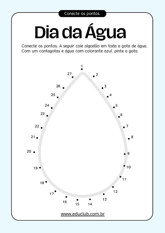 Nesta atividade de artes do Dia Mundial da Água, você encontrará uma folha com uma imagem de gota d'água para conectar pontos numerados de 1 a 27. O material sugere a utilização de algodão para preencher a gota e um conta-gotas com água colorida para pintá-la, proporcionando uma experiência multissensorial.