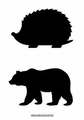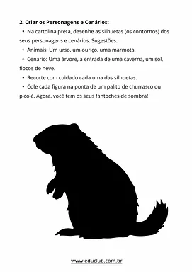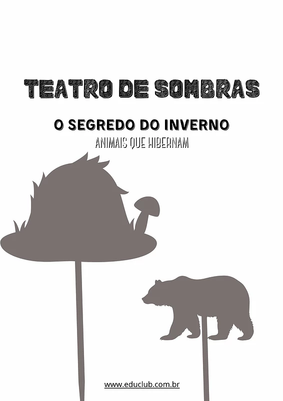 • Guia para criação dos personagens: Ensina a desenhar as silhuetas de animais que hibernam (urso, ouriço) e elementos de cenário (árvore, caverna, flocos de neve) na cartolina preta e a transformá-los em fantoches de sombra com os palitos.