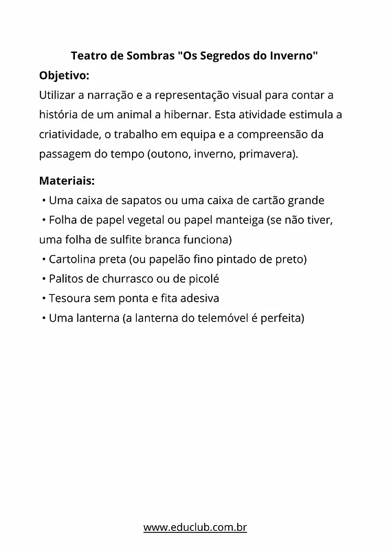 O Teatro de Sombras do Inverno é um projeto completo que integra linguagens, estimula a colaboração e mostra às crianças que, com um pouco de criatividade, uma caixa de sapatos pode se transformar em um portal para mundos fantásticos. Faça o download, apague as luzes, acenda a imaginação e deixe a magia das histórias acontecer.