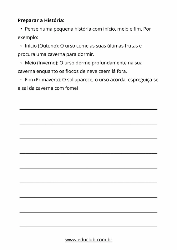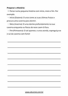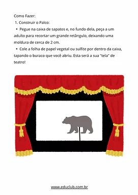 • Roteiro para a história: O material não apenas ensina a montar o teatro, mas também a pensar na história! Ele guia a criança a criar uma narrativa com começo (outono, preparação para dormir), meio (inverno, o sono profundo) e fim (primavera, o despertar), usando o exemplo de um urso faminto.