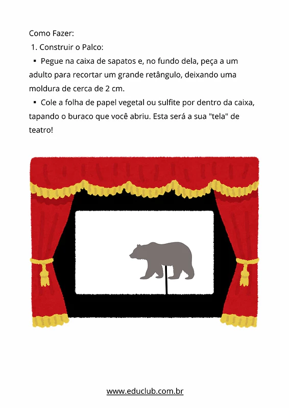 • Instruções de montagem do palco: Um passo a passo claro sobre como transformar a caixa de sapatos em um palco com uma tela translúcida.