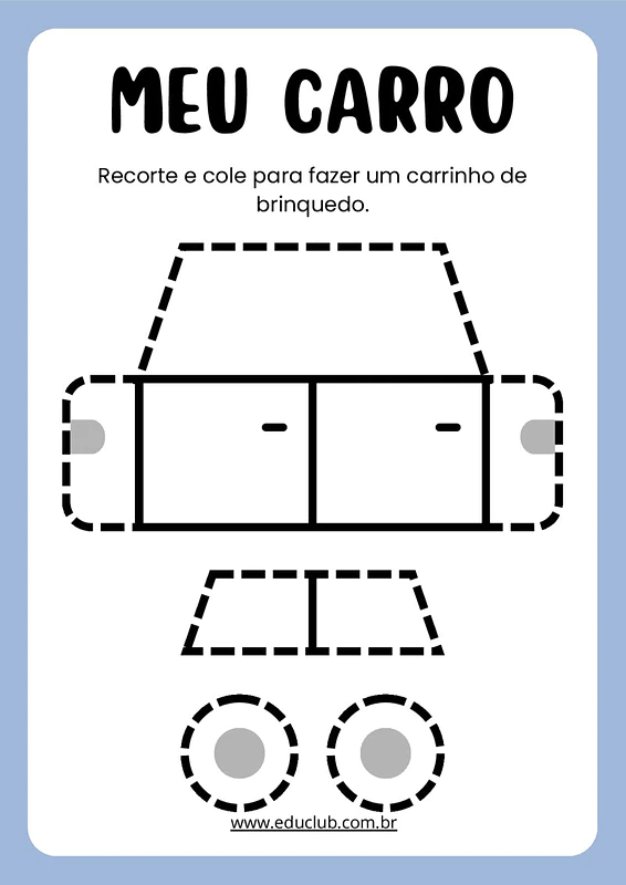 - Instrução de Montagem: Um guia visual que orienta a criança sobre onde aplicar a cola para que o carro ganhe sua forma final.