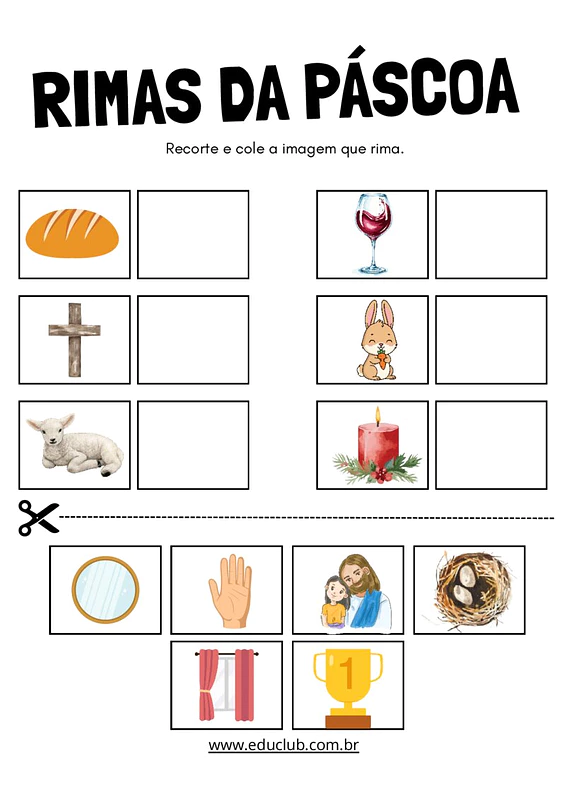 Nesta sobre rimas de Páscoa para alunos dos anos iniciais, você encontrará uma folha de atividades com imagens relacionadas à Páscoa e espaços para que os alunos recortem e colem as figuras que rimam. O material é visualmente atraente e de fácil compreensão para as crianças.
