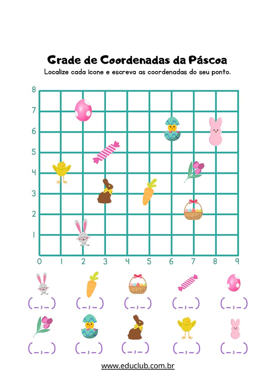Nesta atividade de coordenadas da Páscoa, você encontrará uma grade de coordenadas com diversos ícones temáticos da Páscoa. Os alunos deverão localizar cada ícone e preencher os pares ordenados correspondentes, praticando a leitura e escrita de coordenadas de forma interativa.