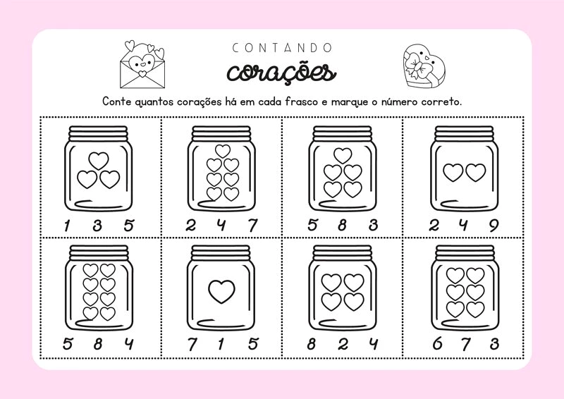 Nesta atividade de corações, você encontrará folhas de atividades com frascos contendo diferentes quantidades de corações. As crianças deverão contar os corações em cada frasco e marcar o número correspondente entre as opções apresentadas, estimulando a percepção visual e a coordenação motora fina.