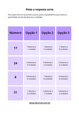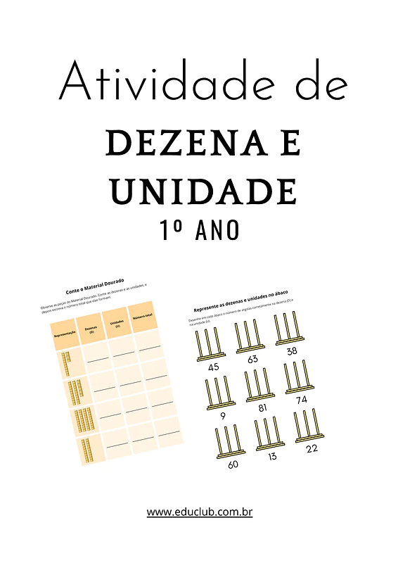 Nosso arquivo em PDF é uma coleção de 8 tipos de exercícios que trabalham o conceito de dezena e unidade de múltiplas formas, reforçando o aprendizado.
