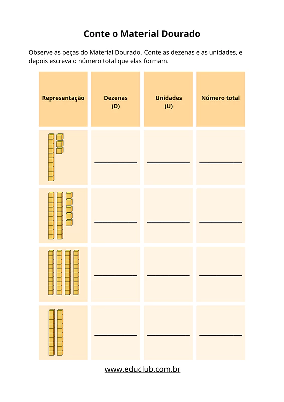 1. Contagem com material dourado: A criança observa as representações das barras (dezenas) e dos cubinhos (unidades) e registra as quantidades, descobrindo o número total.