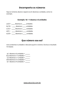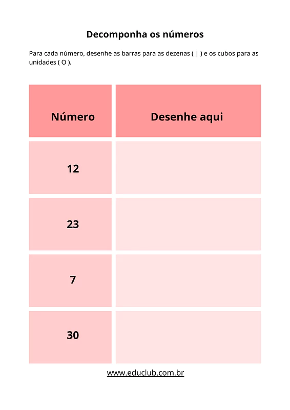 3. Decomposição de números: A atividade clássica de separar um número em suas partes. Exemplo: "25 = 2 dezenas e 5 unidades".