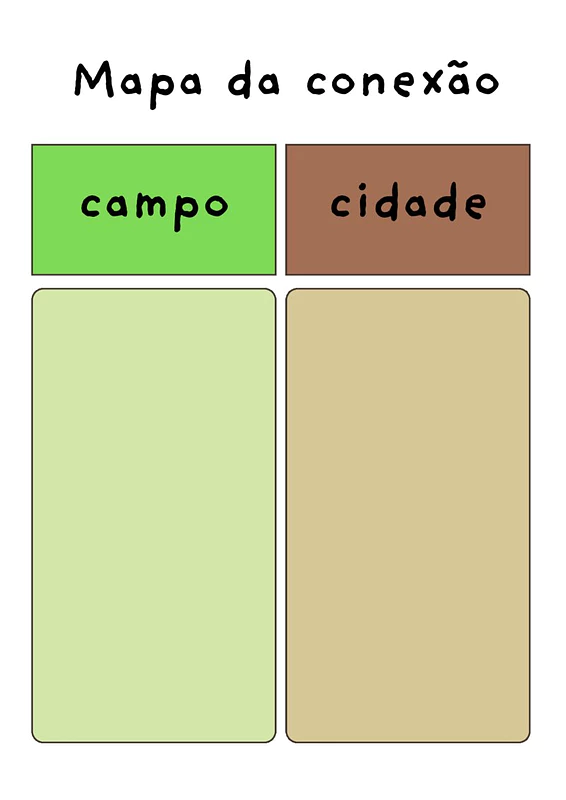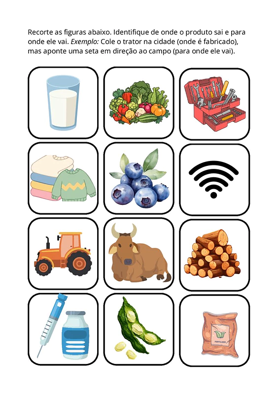 Nesta atividade, você encontrará um mapa da conexão campo-cidade e diversas figuras para recorte. As figuras representam produtos e elementos que transitam entre o campo e a cidade, permitindo que os alunos identifiquem suas origens e destinos, como o exemplo do trator que é fabricado na cidade e utilizado no campo.
