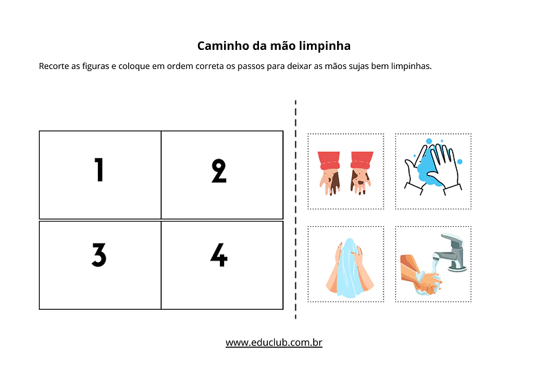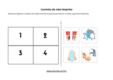 1. Caminho da mão limpinha: Uma atividade de sequenciamento lógico. A criança deve recortar e colar 4 cenas na ordem correta, desde a mão suja até a mão limpa e seca, compreendendo o processo passo a passo.