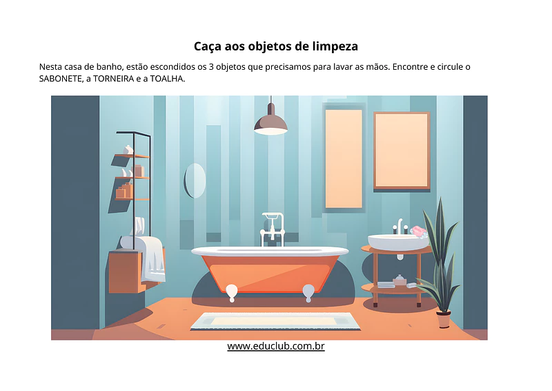 2. Caça aos objetos de limpeza: Um divertido caça-palavras visual! Em uma ilustração de um banheiro, a criança precisa encontrar e circular os três itens essenciais para a lavagem das mãos: o sabonete, a torneira e a toalha.