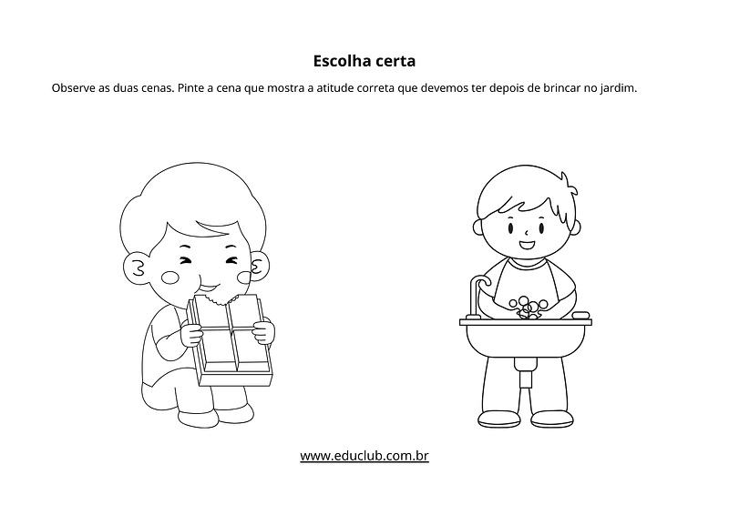 3. A escolha certa: Uma atividade de tomada de decisão. A criança observa duas cenas e deve pintar apenas a que mostra a atitude correta a se tomar depois de brincar no jardim, reforçando a ideia de lavar as mãos antes de comer ou tocar o rosto.