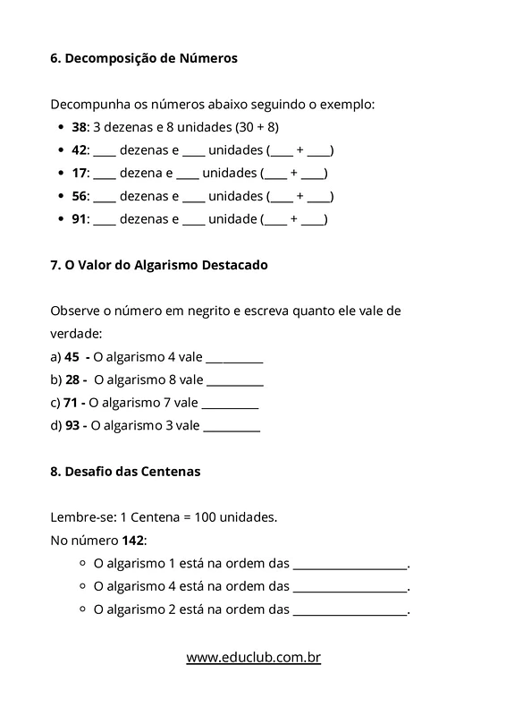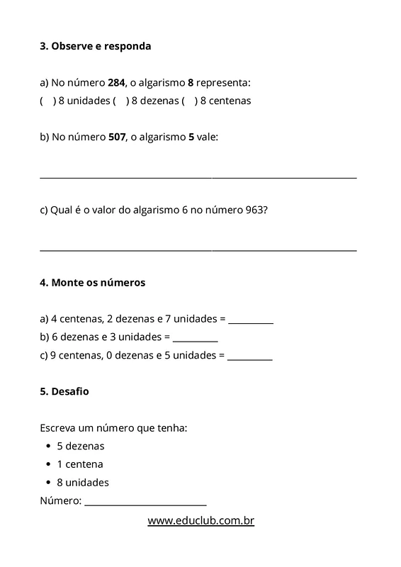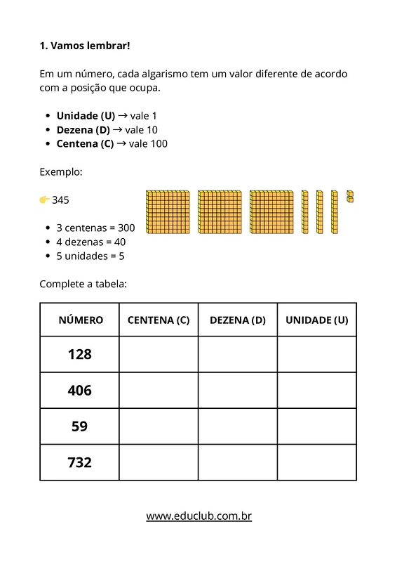 Nesta atividade sobre valor posicional dos algarismos, você encontrará exercícios para completar tabelas de centenas, dezenas e unidades, questões de múltipla escolha e abertas sobre o valor dos algarismos, atividades de montagem e decomposição de números, desafios de identificação numérica e representação com Material Dourado virtual.