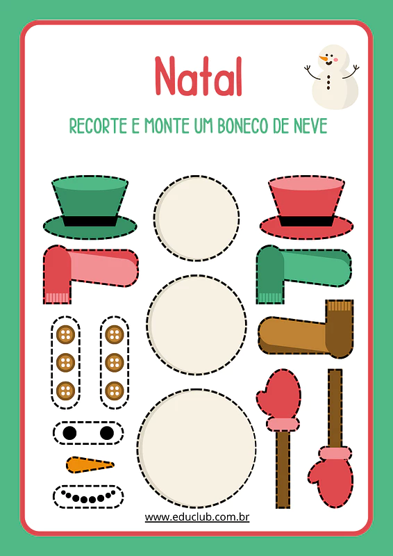 A atividade de Natal para recortar e montar um boneco de neve é um recurso pedagógico completo, que vai além do entretenimento. Ao proporcionar esta atividade, o Educlub.com.br oferece uma ferramenta que contribui para o desenvolvimento de habilidades essenciais na Educação Infantil, de forma lúdica, criativa e alinhada às diretrizes da BNCC.