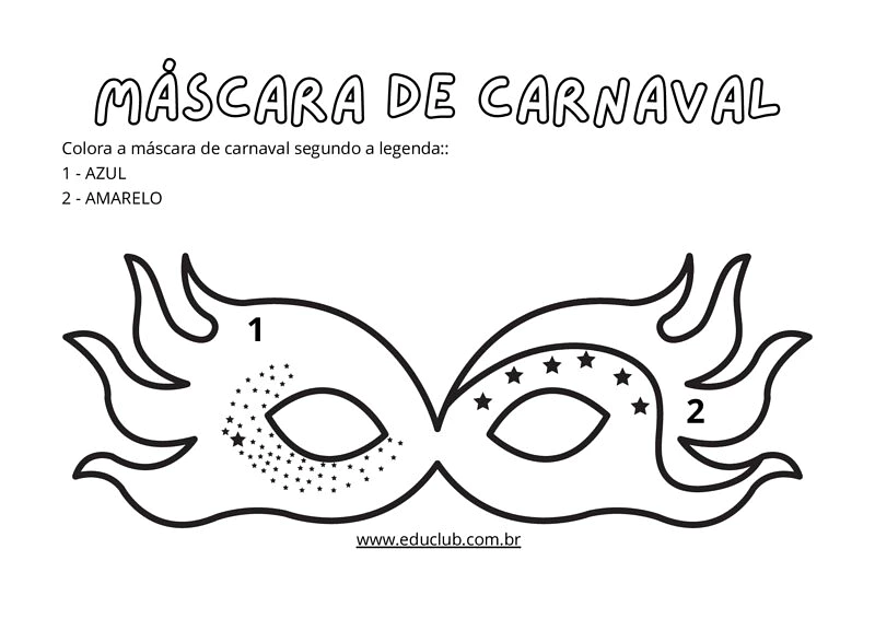 Neste material, você encontrará uma máscara de Carnaval pronta para ser colorida, acompanhada de uma legenda numérica que associa cada número a uma cor específica (azul e amarelo). O design simples e claro facilita a compreensão e a execução da atividade pelas crianças.