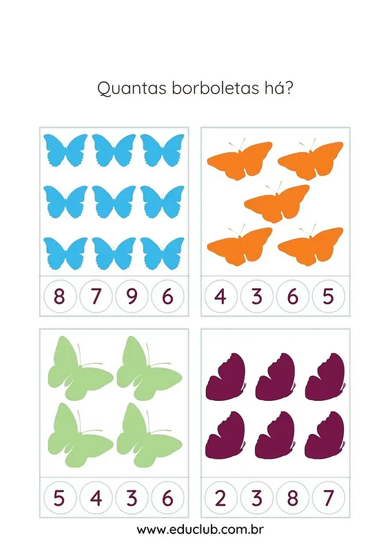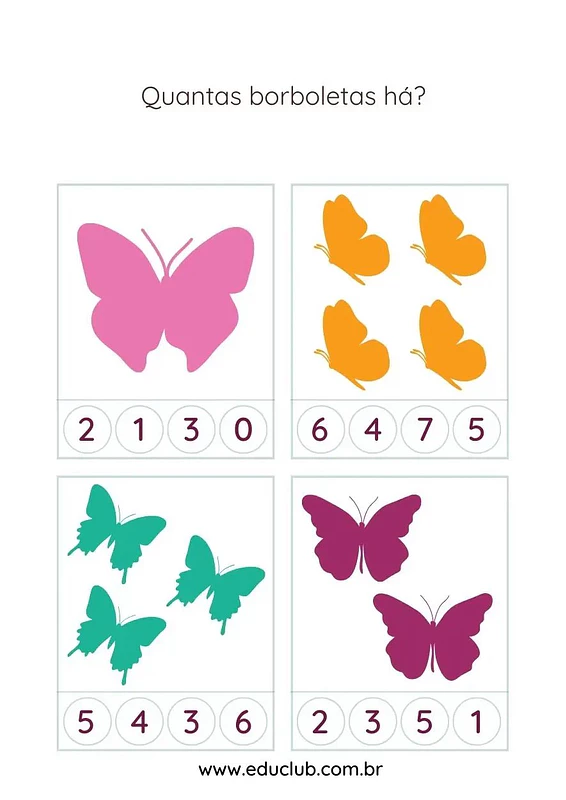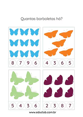 Quantas borboletas há é uma atividade de quantidade destinada a contar e circular o número correspondente. Cada página contem quatro cartões com uma quantidade X de borboletas. A criança deve conta-las e circular ou colorir o número correto. Nesse exercício trabalhamos a contagem de números do 0 ao 9.