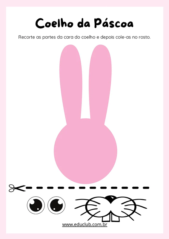 Nesta atividade, você encontrará um molde de coelho de Páscoa pronto para ser recortado e montado. O exercício da Páscoa inclui as partes da cara do coelho, que devem ser recortadas e coladas no rosto, permitindo que a criança personalize seu próprio coelhinho.