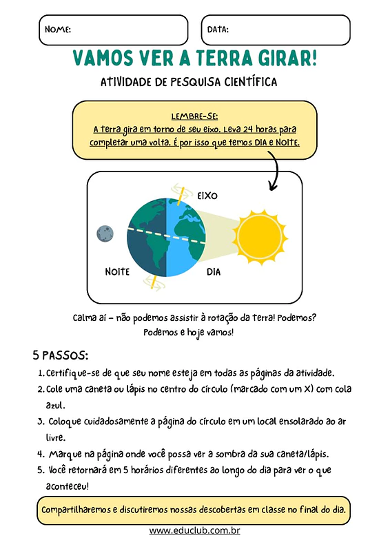 Nesta Atividade de rotação da Terra, você encontrará um guia passo a passo para realizar uma pesquisa científica prática. O material inclui instruções detalhadas para montar um experimento simples utilizando uma caneta/lápis e a observação da sombra ao longo do dia, além de espaços para registro das observações.