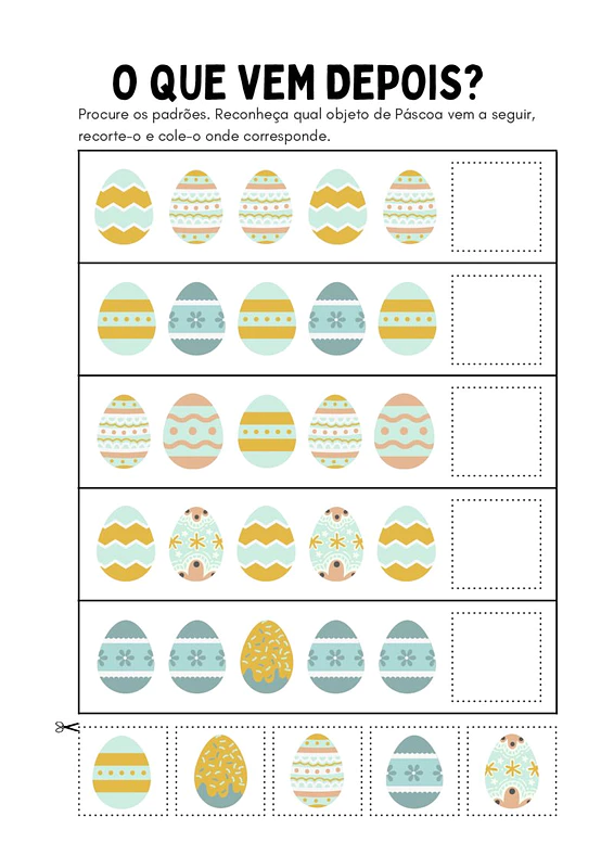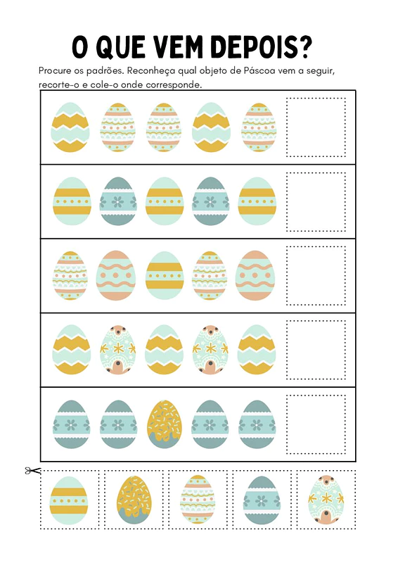 Nesta atividade de sequência e padrões de cores de Páscoa, você encontrará diversas propostas com padrões visuais relacionados à Páscoa. As crianças deverão identificar qual objeto de Páscoa completa a sequência, recortá-lo e colá-lo no local correto, reforçando o aprendizado de forma interativa.