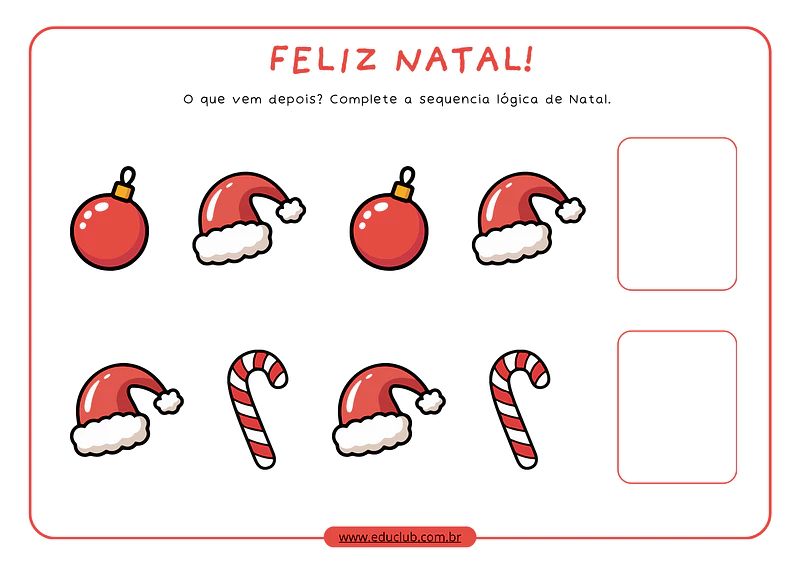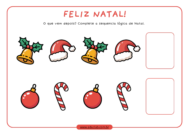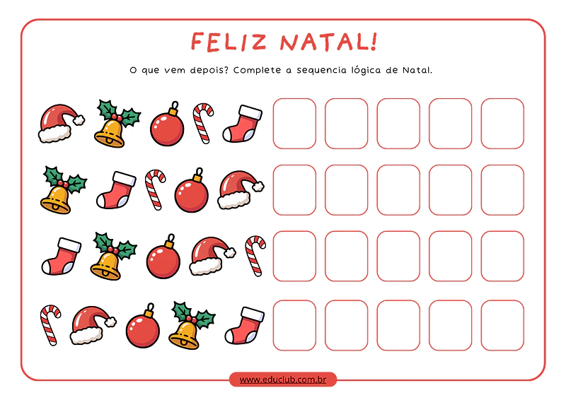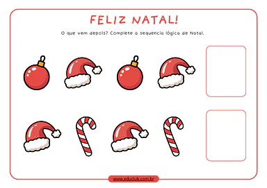 A atividade de sequência lógica dos enfeites de Natal une o útil ao agradável. Ela transforma o desenvolvimento de habilidades cognitivas importantes, como o raciocínio lógico e a percepção de padrões, em uma brincadeira temática e envolvente, garantindo a atenção e o engajamento dos pequenos no clima mágico do Natal.