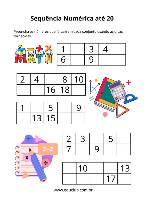 Compreender a ordem dos números e os padrões que eles formam é essencial para o desenvolvimento do raciocínio matemático. Esta atividade desafia os alunos a identificarem números faltantes em diferentes contextos dentro do intervalo de 1 a 20, utilizando pistas visuais e lógica para completar as séries. É um recurso excelente para fortalecer a base numérica antes de avançar para números maiores.