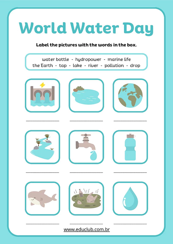 Nesta atividade, você encontrará uma folha de atividades com nove imagens relacionadas à água e ao seu uso, como 'water bottle', 'hydropower', 'marine life', 'the Earth', 'tap', 'lake', 'river', 'pollution' e 'drop'. Os alunos deverão rotular cada imagem utilizando as palavras fornecidas em um quadro, o que facilita a compreensão e a fixação do vocabulário.