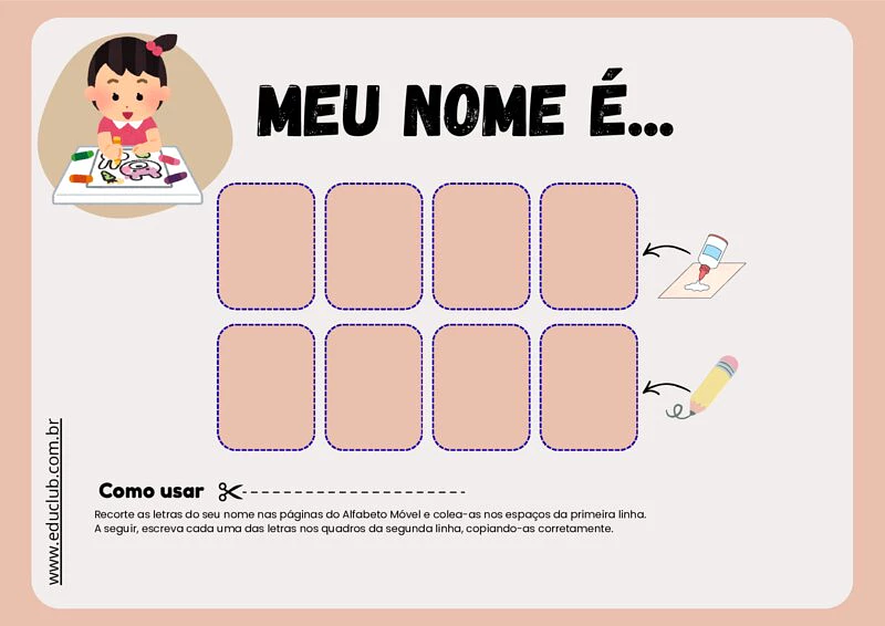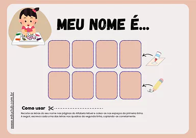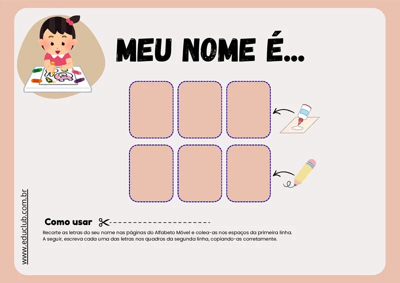 Para trabalhar a atividade do nome próprio para Educação Infantil, oriente as crianças a recortarem as letras de seus nomes do alfabeto móvel e colá-las na primeira linha. Em seguida, elas devem copiar cada letra nos quadros da segunda linha. Esta atividade pode ser complementada com a identificação de colegas que possuem letras iguais em seus nomes.