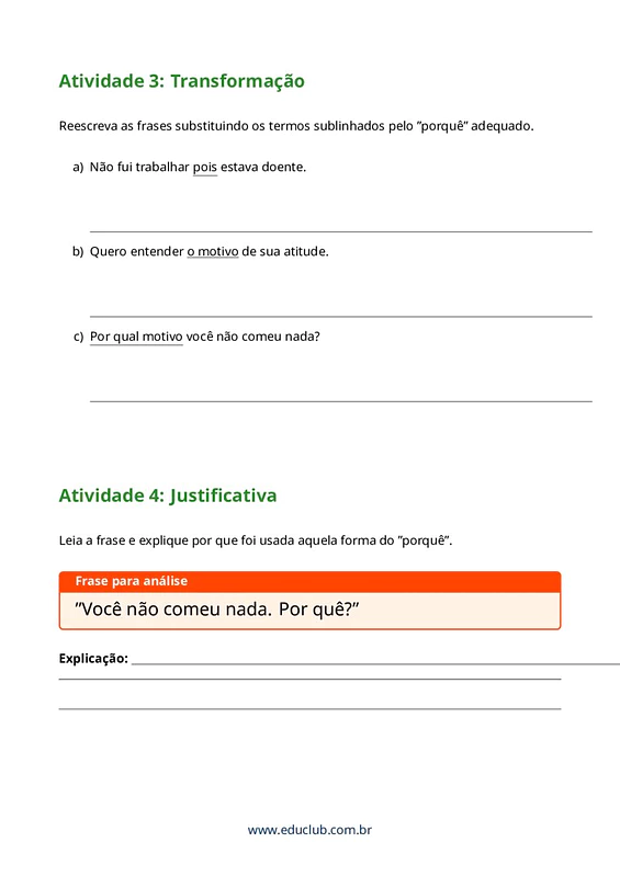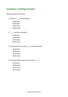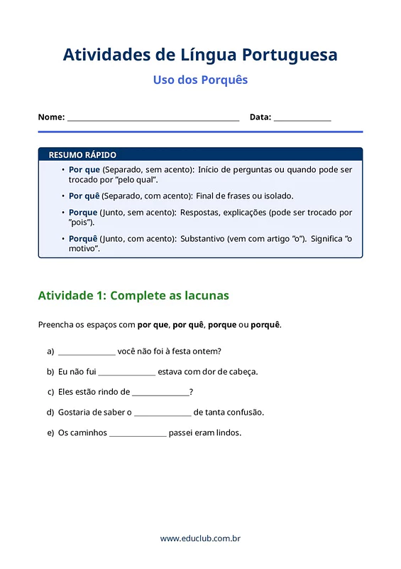 Nesta atividade do uso dos porquês, você encontrará um resumo rápido das regras, cinco atividades variadas (completar lacunas, múltipla escolha, transformação, justificativa e criação de frases) e um gabarito detalhado para autocorreção ou correção em sala de aula.