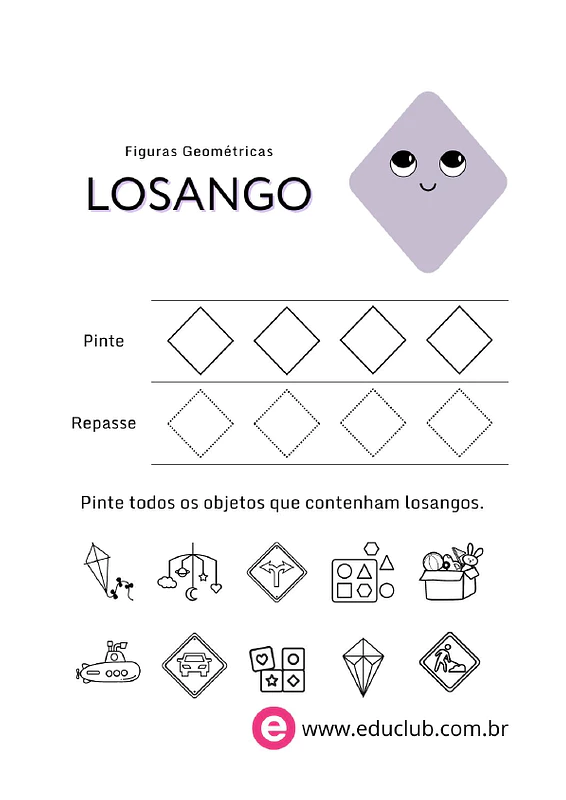 O losango é uma forma geométrica plana que possui quatro lados de igual comprimento. Os ângulos opostos são iguais e os lados opostos são paralelos. Nesta atividade, nossos meninos e meninas refazem o traçado de um losango. Para isso, devem pintar os losangos e repassa-los. A seguir, deve pintar todas as coisas que sejam um losango. Por exemplo, uma pipa, um sinal de trânsito ou um diamante.