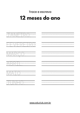 - A primeira linha apresenta o nome do mês em letra pontilhada, para que a criança possa traçar por cima, praticando o movimento e a forma de cada letra.