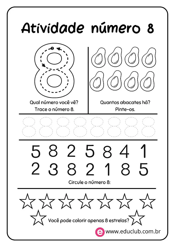 A atividade com o número 8 é uma forma de ajudar as crianças a reconhecer e praticar esse número. As tarefas incluem traçar o número oito várias vezes, o que melhora a coordenação motora fina e a familiarização com sua forma. Em seguida, as crianças contam e pintam oito abacates, reforçando a habilidade de contagem e a associação do número à quantidade. Outra tarefa é circular o número 8 entre outros números, promovendo a discriminação visual e o reconhecimento do número em diferentes contextos. Por fim, devem pintar somente 8 estrelas em um conjunto maior de estrelas o que ajuda a consolidar a compreensão do conceito de quantidade e a precisão na contagem.