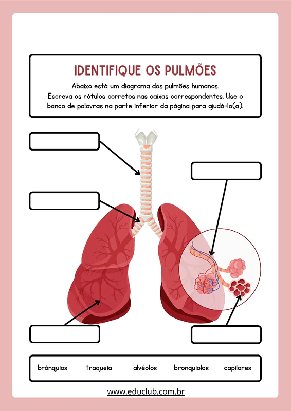 O principal objetivo da atividade sobre as partes dos pulmões é auxiliar os alunos na identificação e nomeação das principais estruturas do sistema respiratório, como traqueia, brônquios, bronquíolos, alvéolos e capilares. Busca-se também desenvolver o vocabulário científico e a compreensão da organização do corpo humano.