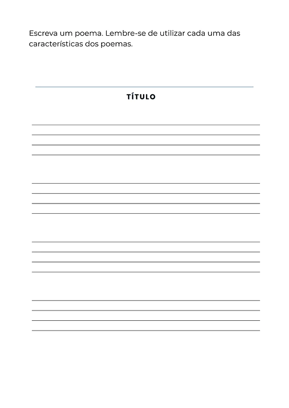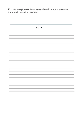 1. Modelo para poema tradicional: Uma folha com espaço para o título e linhas para os versos. É o formato clássico, que convida a criança a pensar na estrutura do poema, nas estrofes, nas rimas e no ritmo das palavras.