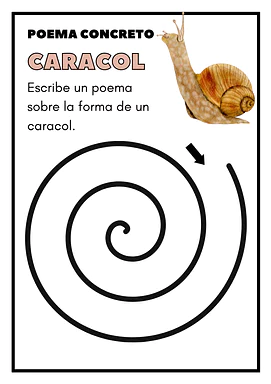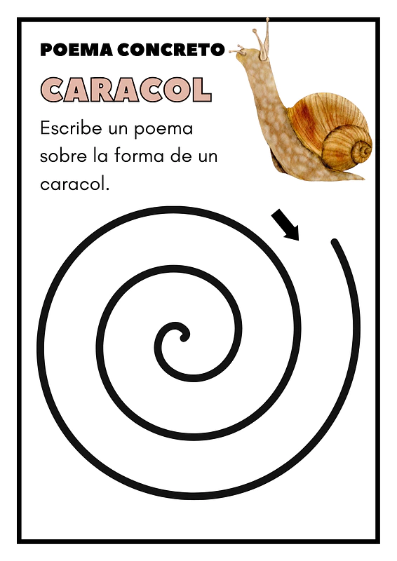 2. Gabarito para poema concreto (visual): Um desafio criativo em forma de caracol. No poema concreto, as palavras são dispostas na página de forma a criar uma imagem que se relaciona com o tema do texto. Aqui, a criança é convidada a escrever seus versos seguindo o contorno do caracol, fazendo com que a forma e o conteúdo conversem entre si.