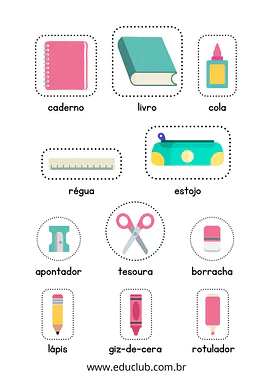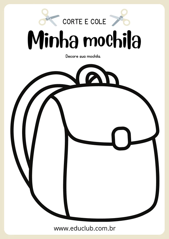 Nesta atividade de recorte e colagem, você encontrará uma ilustração de uma mochila para ser decorada, acompanhada de imagens de diversos materiais escolares como caderno, livro, cola, régua, estojo, apontador, tesoura, borracha, lápis, giz de cera e rotulador. O material propõe uma dinâmica de recorte e colagem para personalizar a mochila.