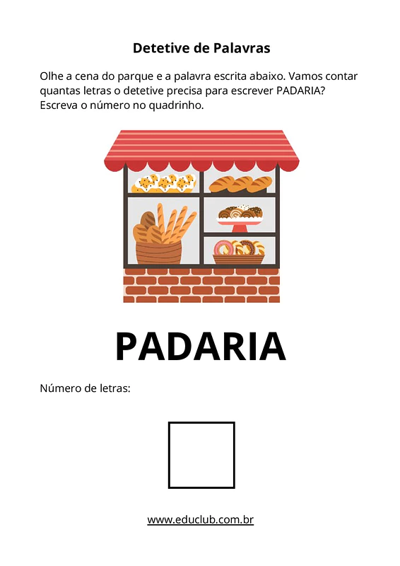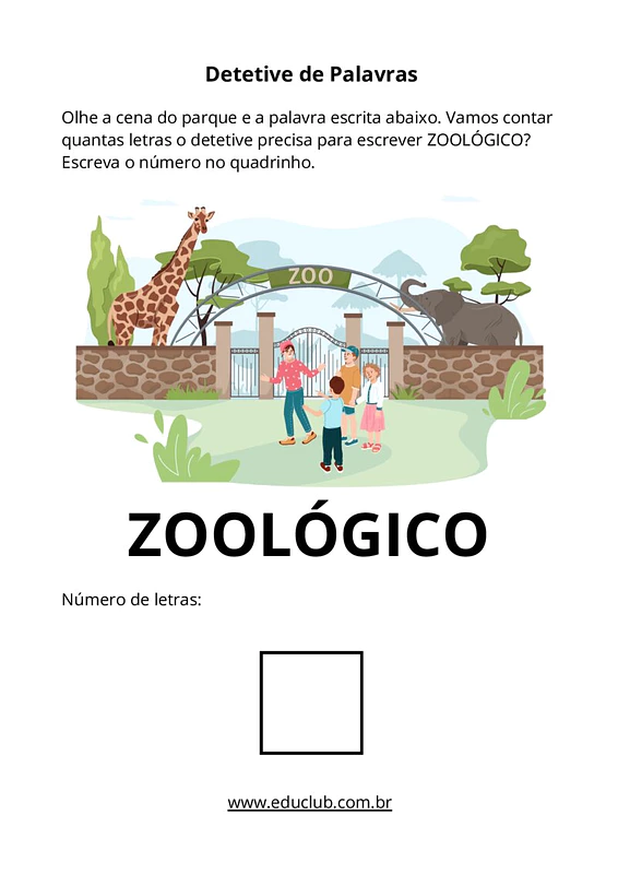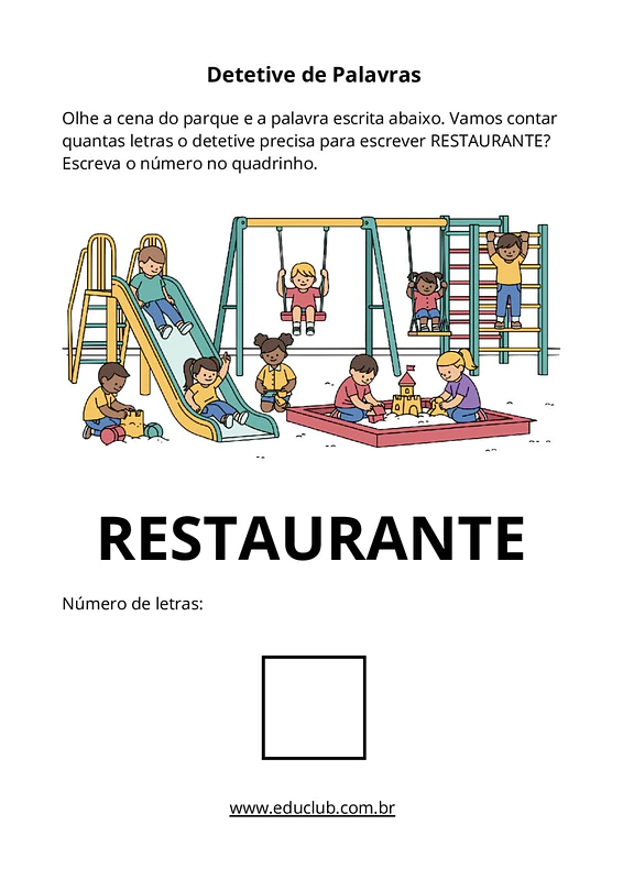 Nesta atividade, você encontrará diversas fichas com imagens de cenários cotidianos, como parque, zoológico, padaria, restaurante, farmácia, escola e casa. Para cada imagem, há uma palavra correspondente e um espaço para que a criança escreva o número de letras que a compõe, incentivando a prática da contagem.