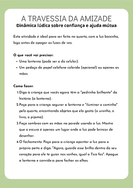 Nesta atividade, você encontrará um roteiro detalhado para uma dinâmica lúdica chamada “A Travessia da Amizade”. O material inclui instruções sobre como utilizar uma lanterna para criar um ambiente mágico, explorar objetos e fazer sombras com as mãos, culminando em um momento de reflexão sobre a luz interior e a confiança.