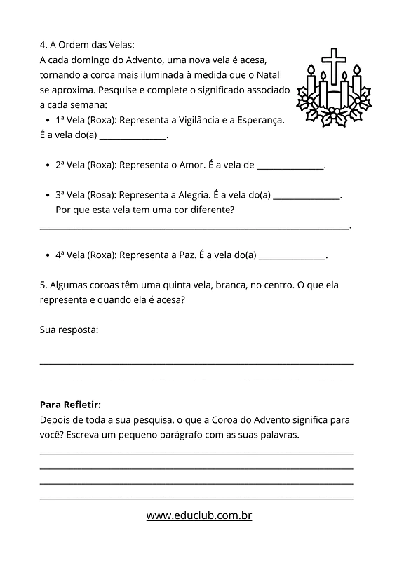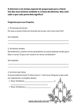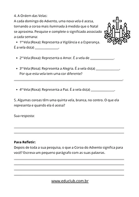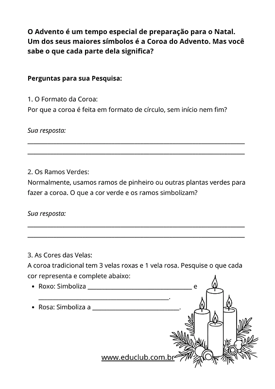- Espaço para Reflexão: Uma seção para que o aluno escreva, com suas próprias palavras, o que a Coroa do Advento significa para ele após a pesquisa.