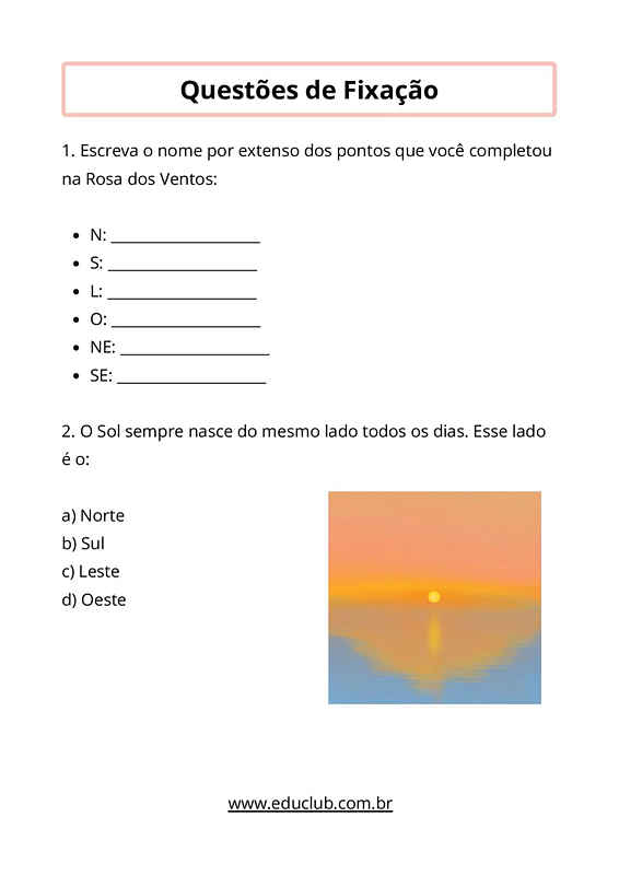 Nesta atividade, você encontrará um diagrama da Rosa dos Ventos para preencher com as siglas corretas dos pontos cardeais e colaterais, seguido de uma etapa de coloração para diferenciar esses pontos. O material inclui também questões de fixação, como a escrita por extenso dos pontos e uma pergunta de múltipla escolha sobre a direção do nascer do sol.