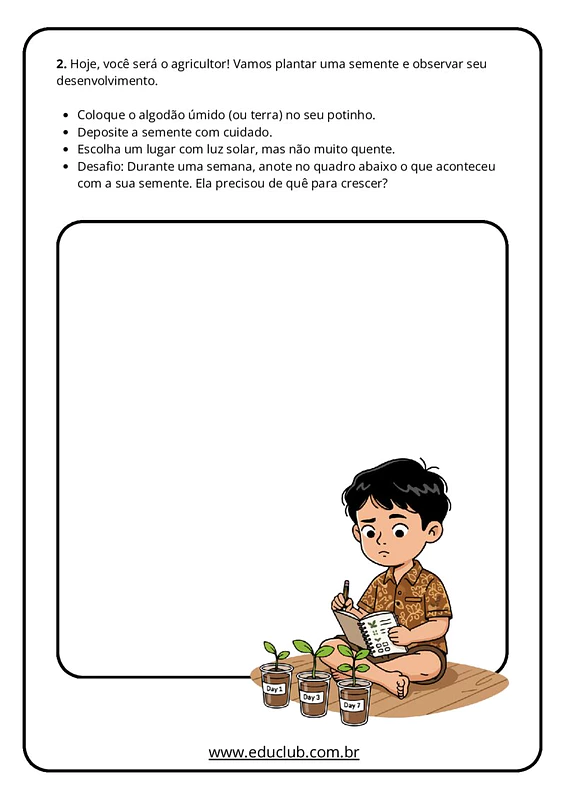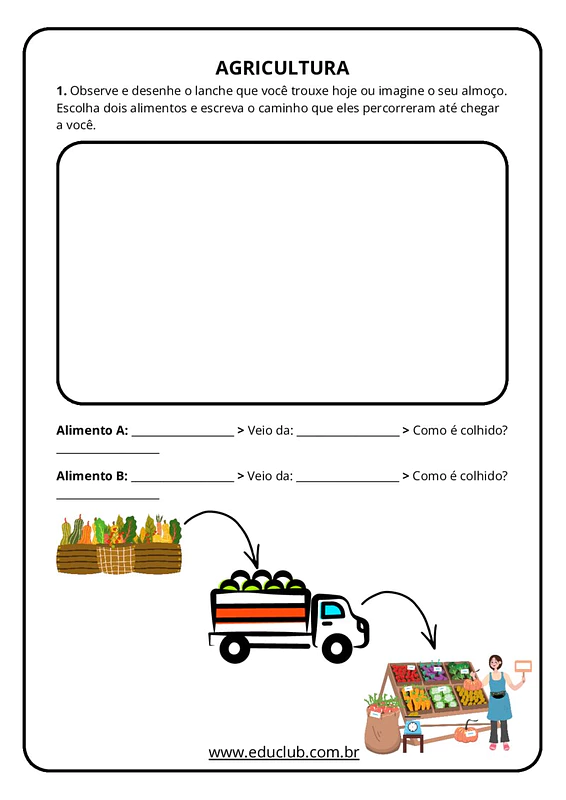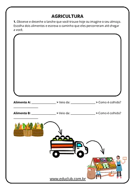 Nesta atividade sobre o tema da agricultura, você encontrará três propostas de atividades. A primeira estimula a reflexão sobre a origem dos alimentos consumidos, a segunda propõe um experimento prático de plantio e observação de sementes, e a terceira desafia os alunos a desenharem e diferenciarem uma horta comunitária de uma grande plantação.